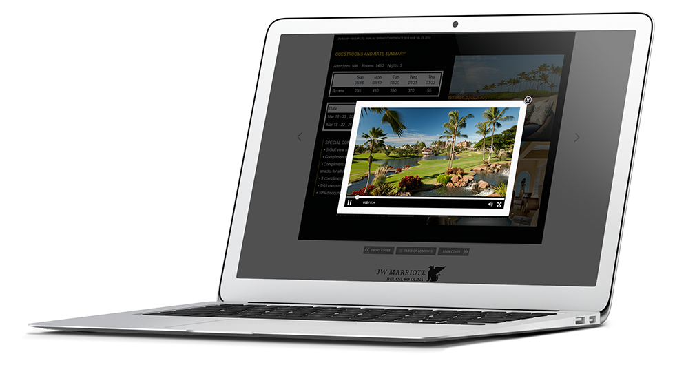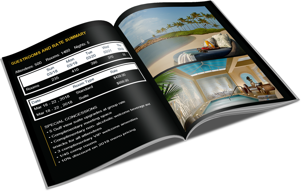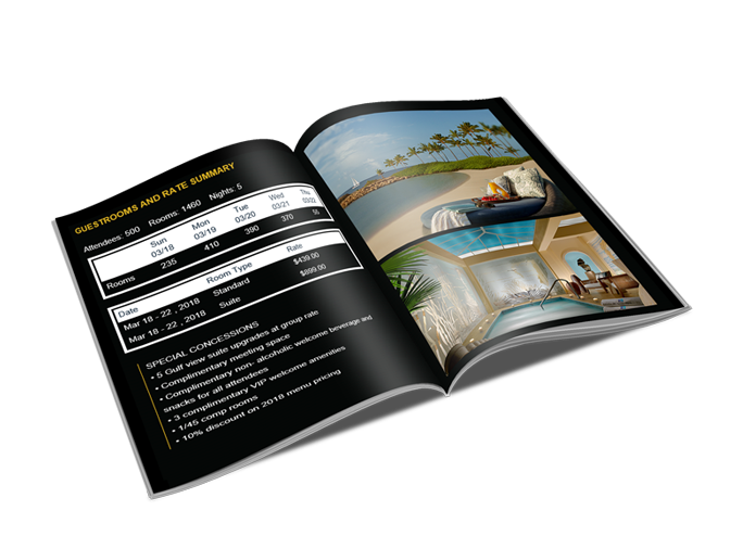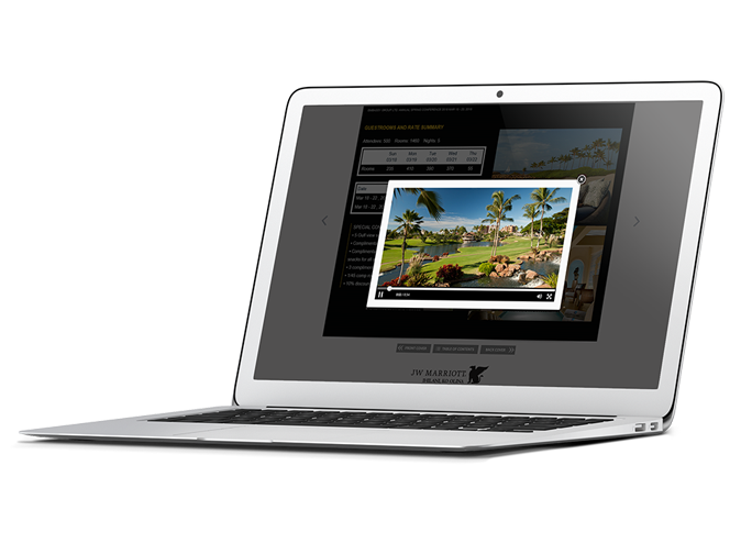 Sales agents select the best welcome, resort and outlet videos. Included is room night information, concessions and offer information about the meeting in an online flipbook.